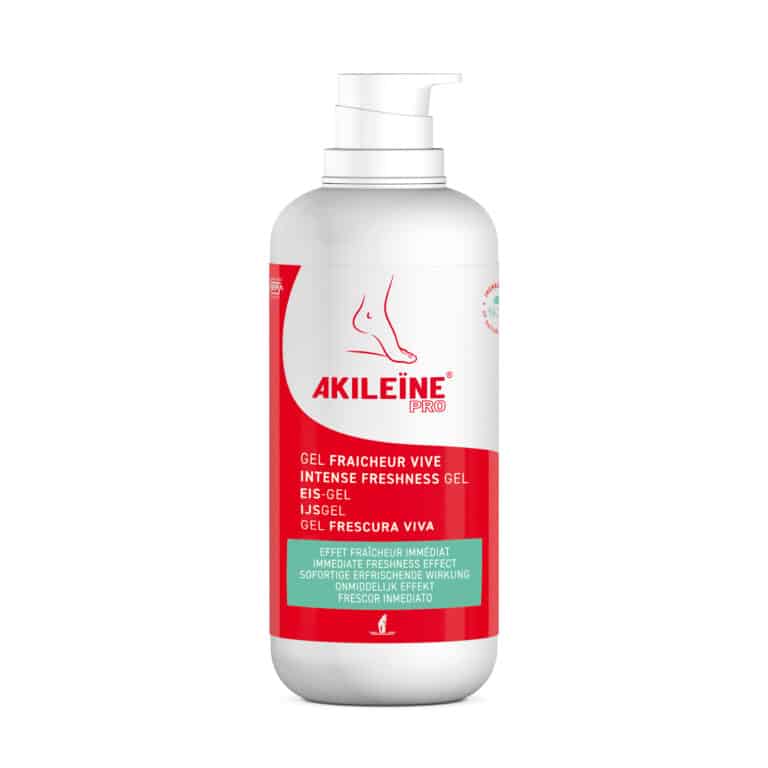 IJsgel 500ml; Helpt bij vermoeide, verhitte voeten. Werkt verfrissend en kalmerend. Gebruik tweemaal per dag. Eigenschappen: De Akileïne® ijsgel met zijn dubbele kalmerende en verfrissende werking, kalmeert en ontzwelt onmiddellijk langdurig vermoeide en verhitte voeten. Verschaft een gevoel van betere voetcirculatie en een verkoelend effect gedurende enkele uren na het aanbrengen. Toepassing: Voer een zeer lichte voetmassage uit van de voetzool tot aan de enkel. Twee keer per dag gebruiken. Plakt niet en maakt geen vlekken. Ook verkrijgbaar: IJsgel tube 75ml  en IJsgel tube 125 ml