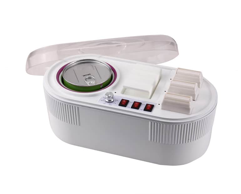 Waxverwarmer die een waxsmeltbak combineert voor potten van 800 g. en drie spots voor standaard waxpatronen.