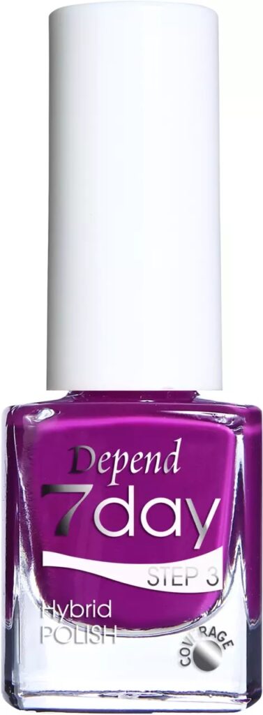 Alle kleuren kan je hier vinden Depend hybride 7Days   Depend 7day is een nagellaksysteem voor als je een nagellak wilt met superglans, topklasse duurzaamheid en een “gelgevoel”. Deze hybride formule houdt tot een week, is gemakkelijk aan te brengen en is gemakkelijk te verwijderen met Depend nagellakremover. Geen LED/UV-lamp nodig – dit nagellaksysteem hardt uit bij normaal daglicht of elektrisch licht.