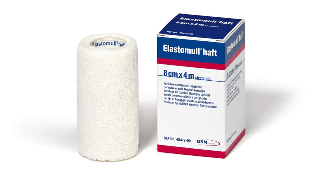 Elastomull is een hoogelastisch en op zichzelf klevende fixatiewindel, rekbaar tot 2 ½ maal zijn oorspronkelijke lengte. De afzonderlijke windingen dienen elkaar slechts voor 1/4 te overlappen. Elastomull Haft is micro-poreus met latex geïmpregneerd zodat de windel op zichzelf kleeft maar niet op huid of haar. Dankzij zijn hoog gehalte aan cellulose wordt Elastomull zeer goed door de huid verdragen. Kan met gas of in de autoclaaf gesteriliseerd worden. Bestaat uit 38% katoen, 32% viscose en 30% polyamide. Is geschikt voor de fixatie van verbanden, voornamelijk aan de extremiteiten, gewrichten en aan het hoofd.