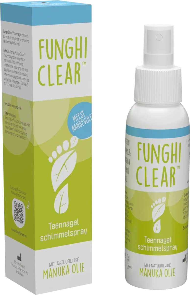 Voet- en nagelschimmel is een veelvoorkomende aandoening die niet alleen ongemak kan veroorzaken, maar ook een negatieve invloed kan hebben op het zelfvertrouwen. Hoewel er verschillende behandelingen beschikbaar zijn, zijn veel van deze behandelingen niet effectief genoeg om de schimmel volledig te bestrijden en terugkerende infecties te voorkomen. Funghi Clear kan dit wel. Funghi Clear is een anti-schimmel spray die is samengesteld uit natuurlijke ingrediënten, waaronder Manuka olie. Die bekend staat om zijn antibacteriële en antifungale eigenschappen. De spray is ontwikkeld met zorgvuldig geselecteerde ingrediënten die helpen om de nagel opnieuw in goede conditie te brengen, terwijl het tegelijkertijd bestaande infecties bestrijdt en toekomstige infecties voorkomt. De natuurlijke formule is veilig in gebruik en is geschikt voor mensen van alle leeftijden.