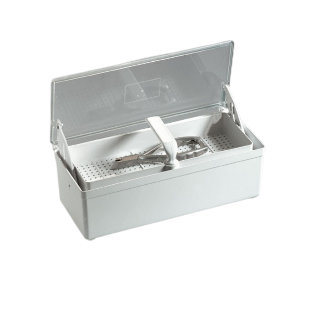 Solide witte kunststof instrumentenbak. Inhoud 1000 ml. Voorzien van zeef zodat u de instrumenten uit kunt laten lekken.