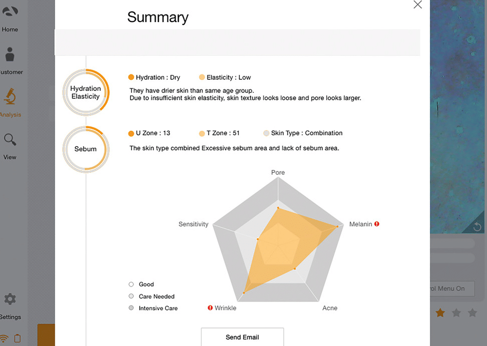 HUIDANALYSE IN ZAKFORMAAT De nieuwste generatie van huidanalyse is deze IONTO-SCOPE API 100. Het uitgangspunt is nog steeds een optimale huidanalyse voorafgaand aan uw behandeling om daarmee succesvol te kunnen behandelen. De IONTO-SCOPE API 100 gebruikt u in combinatie met een tablet, hierdoor is het voorheen ingebouwde scherm in de scope komen te vervallen. Op deze manier worden veel kosten bespaard en daarmee is de IONTO-SCOPE API 100 zeer interessant voor de portemonnee. De camera, die wordt gebruikt voor de professionele analyse van huid voor gezichtsbehandelingen zorgt voor haarscherpe beelden welke overzichtelijk in grafieken worden omgezet. Deze analyse en grafieken kunt u via de tablet samen met de klant bekijken. UITVOERING – FUNCTIES • Menu navigatie via App voor computer, tablet en smartphone • Geïntegreerde meet sensoren • Vergelijking van de beelden met opgeslagen waarden en beelden van eerdere metingen • Grafische, algemene evaluatie huidbeeld • Schermoverdracht per Wifi Levering: • Oplaadstation • 1 accu’s • USB kabel • 2 boxen met Sebumpapier Technische gegevens: Camera: 2 mega pixels Belichting: Normaal, polarisatie, UV Uitgang: Micro – USB