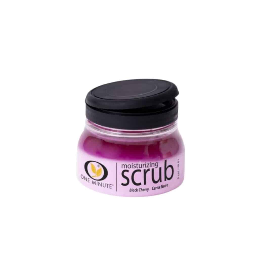 ONE MINUTE Scrub Black Cherry 283gr ex folieert, herstelt en hydrateert de huid met een aantrekkelijke botanische mix op basis van essentiële oliën en triple-gefreesd Dode Zee minerale zouten.