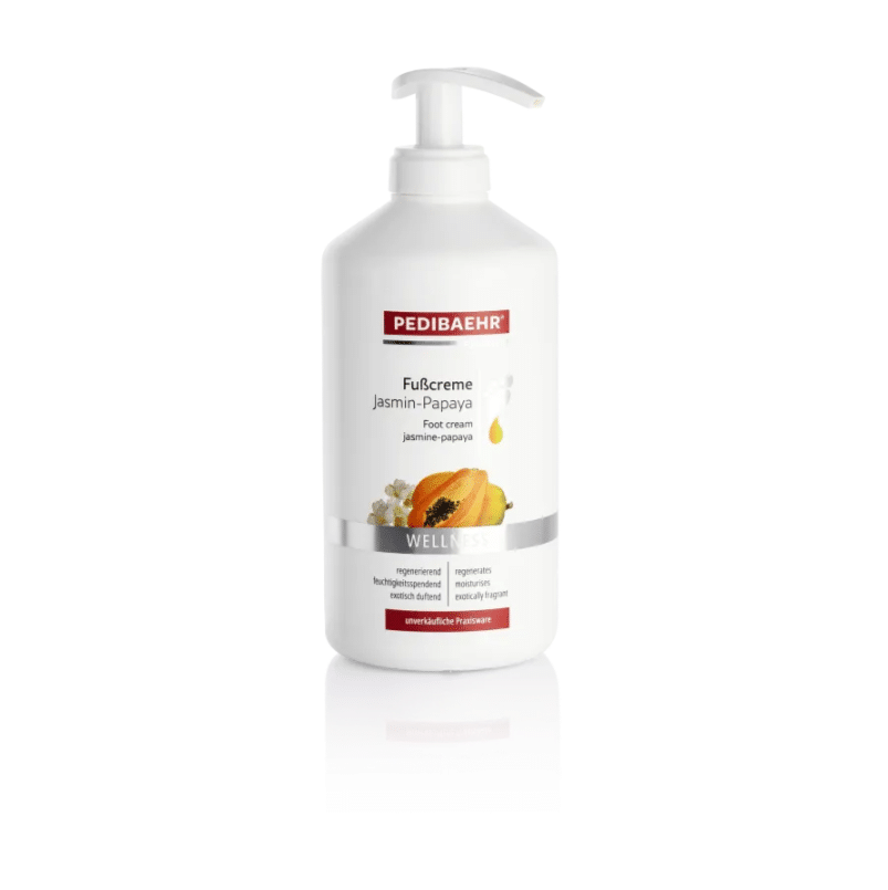 Pedibaehr Voetcreme jasmijn-papaya 500ml; Herstelt en hydrateert droge voeten met sheaboter, ureum en vitamine E, terwijl farnesol de huidflora in balans houdt en een exotische geur van jasmijn en papaja verfrist. Veganistisch.