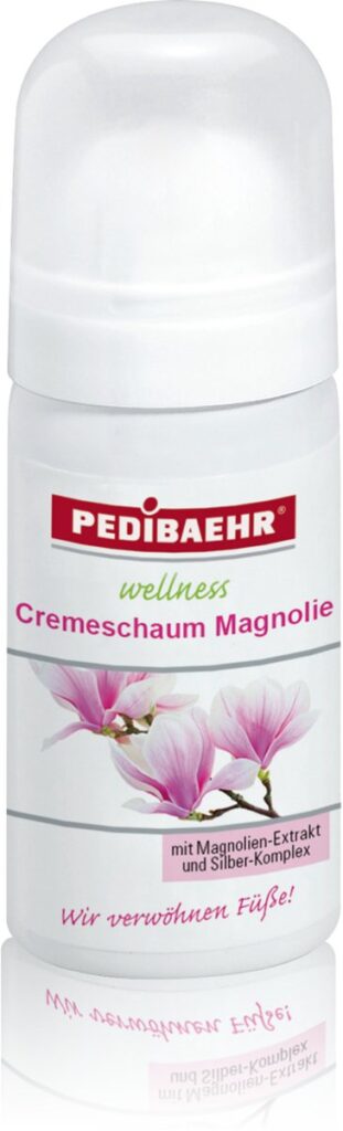 PEDIBAEHR magnolia crèmeschuim met een zilvercomplex kan schimmelinfecties voorkomen en de gestreste huid op de voeten regenereren. Met een veganistisch recept van waardevolle plantenextracten en lenteachtige magnoliageur. Met magnolia-extract en zilvercomplex