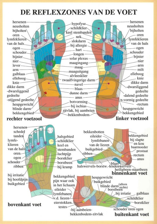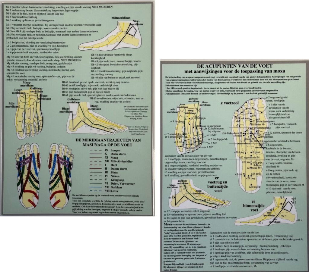 De acupunten van de voet met aanwijzingen voor de toepassing van moxa. Op deze kaart is een veelheid aan gegevens samengebracht die interessant kunnen zijn voor mensen die op een of andere manier met de voeten en/of lichaamsenergie en werken. De informatie aan de ene zijde is een samenvatting van de gegevens uit een recent werk over voetacupuntuur. Drie dingen zijn opmerkelijk. 1 acupuntuurpunten die kunnen worden gebruikt bij typische voetproblemen 2 acupuntuurpunten die kunnen worden gebruikt bij problemen elders in het lichaam 3 acupuntuurpunten die een werking hebben op verschillende organen. Wat dat laatste betreft zijn de localisaties soms wel maar niet altijd in overeenstemming met de opvattingen van voetreflexologen in Nederland en de rest van de westerse wereld. Deze poster is ook zeer goed te gebruiken als hulpmiddel bij uitleg aan patiënten / cliënten tijdens een voetmassage.