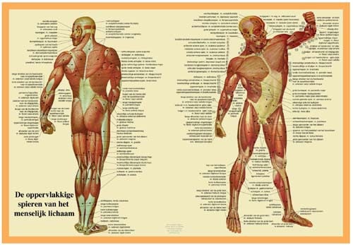 Op deze poster staan de oppervlakkige spieren van het menselijk lichaam met zowel de Nederlandse als de Latijnse benaming.
