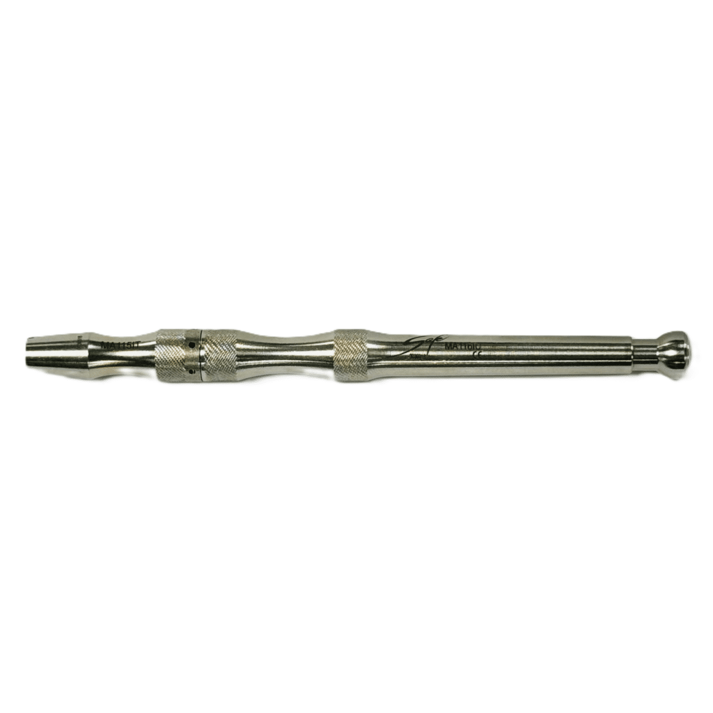 De roestvrijstalen haaigreep is gemaakt om het werk van de gebruiker te vereenvoudigen en te versnellen, met behoud van een hoge veiligheidsstandaard. Dankzij het kogelslotsysteem is de hoofdkop zeer eenvoudig te monteren en te verwijderen. Druk gewoon de knop helemaal in om de kop te verwijderen of te monteren. Om het blad te monteren, draai je gewoon de knop met de klok mee en druk je hem in. Het NIEUWE montagegereedschap verkort de bedieningstijd en maakt het veiliger. Ergonomisch handvat, perfect uitgebalanceerd voor veilig en comfortabel gebruik. Gemakkelijk afwasbaar, desinfecteerbaar en autoclaveerbaar volgens de gebruiksaanwijzing.