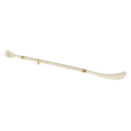 Een cremekleurige plastic schoenlepel met aan de andere kant een rugkrabber. De lengte is ca. 50 cm. Met ophangketting.