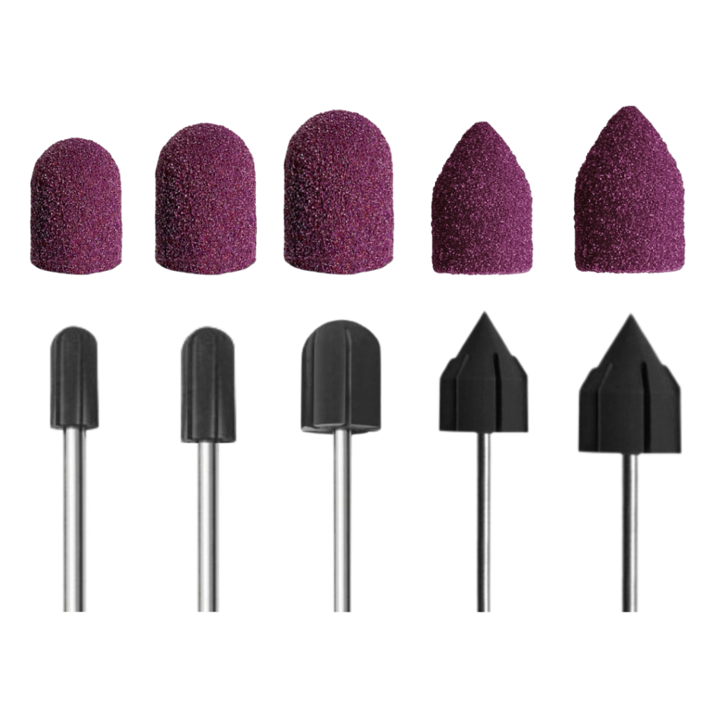 De paarse slijpkapjes: Ook wel de Thermo slijpkap genoemd. Kleurverandering zorgt voor huidbescherming. Zeer geschikt voor diabetici omdat zij (soms) aan hun voeten vaak een verminderde waarneming van temperatuur en pijn (neuropathie) hebben. Een eventueel te hoge slijptemperatuur en een daarmee gepaard gaande oververhitting tijdens de behandeling worden in het ergste geval niet op tijd opgemerkt door de patiënt of de gebruiker. Daar komt nog bij dat wonden bij diabetici slechter genezen. Traditionele instrumenten zoals frezen, diamantslijpers of scalpels brengen vaak het gevaar voor verbrandingen en verwondingen met zich mee – met de dienovereenkomstige nare gevolgen voor diabetici. De ultramoderne THERMO-slijpkap beperkt dit risico tot een minimum. Alleen voor droog techniek (afzuiging). De oranje slijpkapjes: Worden ook wel de Podo slijpkappen genoemd en leveren een beter resultaat door non-stick effect (Anti-aanbak effect vermindert slijpresidu). De oranje slijpkap is gemaakt van schuurpapier (papier en zand), hebben een CE keurmerk en zijn milieuvriendelijk. De slijpkapjes worden veelal gebruikt voor verwijdering van overtollig eelt. Alleen voor droog techniek (afzuiging). De bruine slijpkapjes: Deze slijpkapjes zijn gemaakt van kunststof en hierdoor bruikbaar voor zowel droog- als nattechniek (de paarse en oranje slijpkappen zijn enkel voor droog techniek). Let op! Slijpkapjes zijn gemaakt voor eenmalig gebruik (niet geschikt voor ultrasone reiniging, autoclaaf, UV-lamp of inactiverings-methoden). Alleen voor droog techniek (afzuiging).
