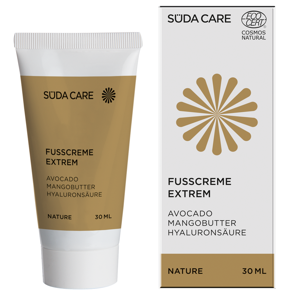 Suda Care Nature Voetcreme Extreme 30ml; Hoog vetgehalte – Calcium PCA versterkt de lipide barrière van de opperhuid. Beschermt tegen trans epidermaal waterverlies (TEWL), intensief hydraterend. De voetcreme extreem is geschikt voor de droge en zeer droge huid.   Inhoud: 30ml ook verkrijgbaar in: 100ml en 500ml